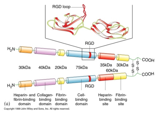 纖連蛋白(fibronectin,FN)最早于1948年由美國生物學家發(fā)現,是一種人體中必需的蛋白質,廣泛存在于哺乳動物組織及組織液中,分子質量為 450 kDa,由兩個分子質量為 220 kDa的亞基通過鏈間二硫鍵連接而成。含有1個獨特的RGD序列和6個功能結構域,經局限性蛋白酶解可切割為幾個結構域,可與血纖蛋白、肝素、膠原、DNA以及細胞表面受體等結合,具有多種生物學功能。