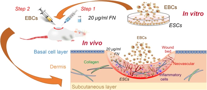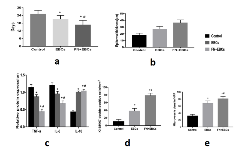 EBC噴霧之前,在創(chuàng)面床上預涂FN通過提高ESCS的利用效率,促進血管生成,減少創(chuàng)面炎癥,調節(jié)膠原的形成和降解,顯著縮短創(chuàng)面愈合時間,增加創(chuàng)面愈合表皮厚度。