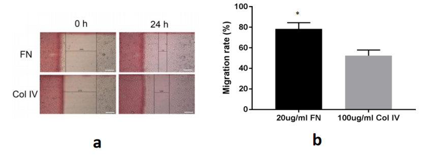 3. 20μg/ml FN100μg/ml COL IV預包被培養(yǎng)皿對細胞遷移的影響[10]