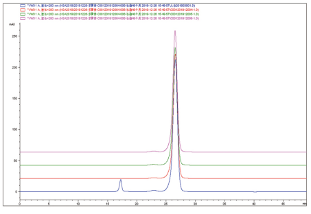 圖2 pHSA與不同批次OsrHSA的HPLC結(jié)果(藍(lán)線-pHSA,其他顏色-OsrHSA)